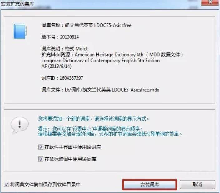 4.出现询问是否安装词典的对话框,点击“安装同义词库”完成扩展同义词库的安装。