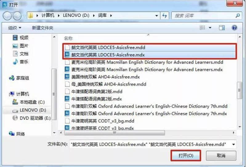 3.按住CRTL键,同时选择字典的mdd文件和mdx文件,然后单击“打开”(注意mdd和mdx文件的文件名必须一致)