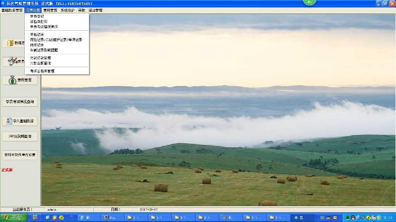 基本信息(教练、员工、车辆、服务类型、学习模式)、流程管理(招生报名、数据受理、教练分配、考勤卡管理、考试申请、一门课预约考试、两门课预约考试、三门课预约考试、学生管理、退费、进度查询、学生信息汇总表、综合统计报表)、费用管理、报表中心等。集学生管理、考试管理、证件管理、强大的报表功能于一体:机动车驾驶人身体状况证明、机动车驾驶证申请表、受理单、学生作业单等报表的打印,支持从Excel导入教练、员工、车辆、服务类型、学习车型等。