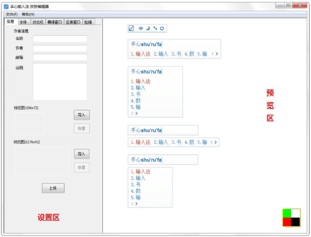手心输入法皮肤编辑器是手掌输入法的皮肤工具。用户可以使用该工具设置自己喜欢的输入法皮肤,以及输入法字号、字体、拼音字符串颜色、焦点候选色、光标颜色、状态栏、横窗、竖窗等元素。