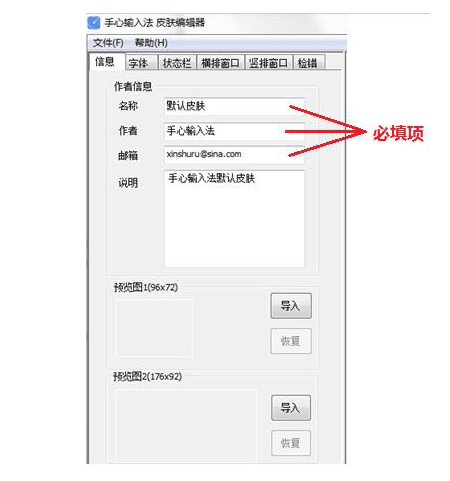 1.打开皮肤编辑器,首先看到的是“”界面。你需要在皮肤中填写相关信息。必须填写皮肤名称、作者和电子邮件地址。此外,您导入的“预览图1”将显示在主输入法程序的设置向导面板上。建议导入图片尺寸为“96x72”,皮肤管理面板显示“预览图2”。建议导入图片尺寸为“176x92”。