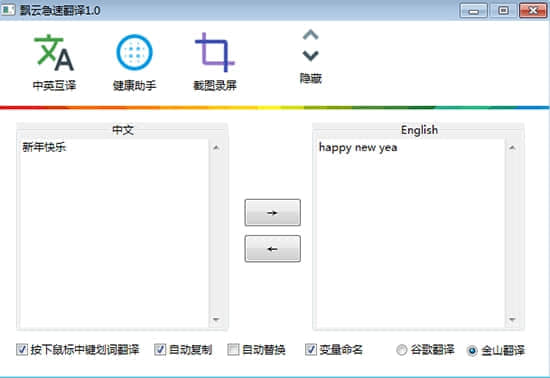 飘云急速翻译是一款非常实用的中英文翻译软件,内置强大的智能识别翻译功能,支持连续翻译、划片翻译、截图翻译等。飘云急速翻译具有强大的OCR翻译功能,翻译结果准确、流畅、完整。欢迎有需要的朋友来体验。