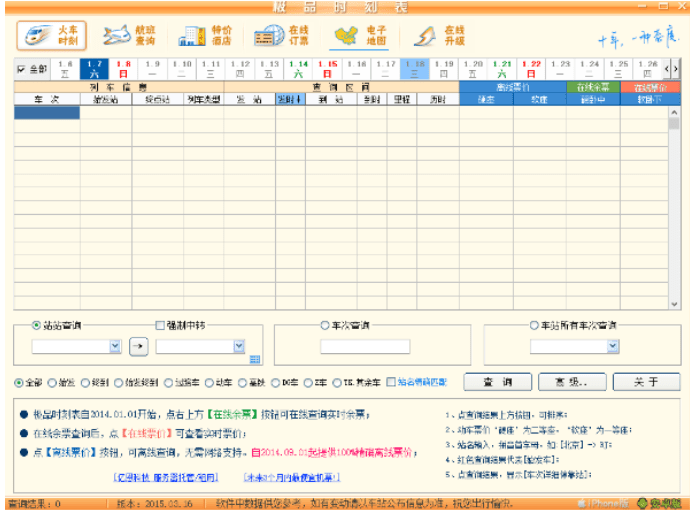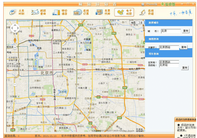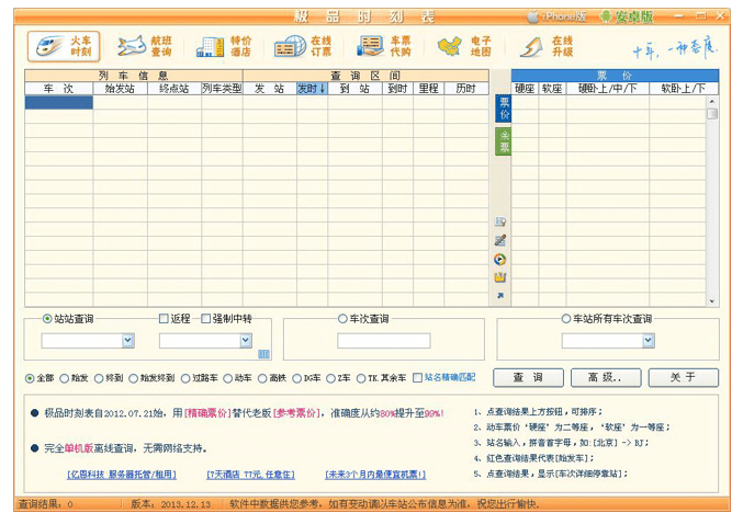 极品列车时刻表是一款可以查询全国列车时刻表的单机软件。其操作不需要网络支持,列车时刻数据更新频率高,查询操作简单快捷,软件小巧,不需要安装或修改注册表,下载后即可直接运行。极品列车时刻表提供车站查询、反向车站查询、车次查询、所有车次查询等查询方式。还具有航班查询、酒店查询、网上订票、购票、电子地图等功能。是出行必备的工具!
