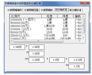 软件的各种计算包括1: 100万、1: 50万、1: 25,000、1: 10万、1: 50,000、1: 25,000、1: 10,000、1: 5,000等八种基本比例尺的地形图。