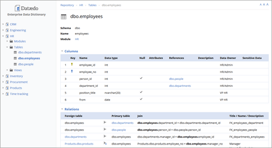 6.Dataedo超越了简单的数据库模式提取,使您能够添加关于数据库的有意义的信息——将对象分组到模块中,记录表关系,并提供定制的描述性元数据字段。