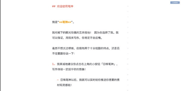 1.一款人工智能网页写作软件:作为一款智能写作工具,笔神可以持续启发你,根据你所写的内容实时推送丰富的素材,帮助你优雅地持续高效地写作和表达。