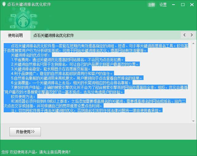 5.软件注册可以直接使用。注册给出5个关键词。该软件在线一小时可获得4分。软件支持百度、360、搜狗100以内排名提升。