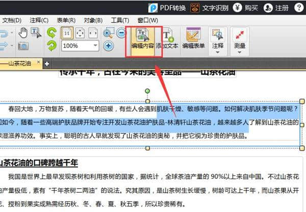 2.打开文档后,点击顶部的“编辑内容”选项,选择要修改的PDF文本。