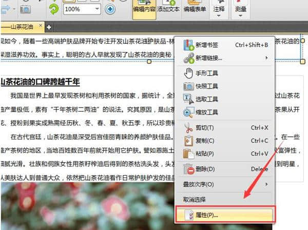 3.点击鼠标右键,选择“属性”功能,编辑修改PDF文本格式。