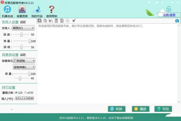 好易迅配音专家这个软件很优秀。它更新了很多新鲜的声音内容,让我们可以随时配置和混合各种声音,帮助用户轻松转换为语音播放,同时还可以设置方言,适用于各种公共场所,可以自由调节不同的声音大小,为你提供清晰的声音。