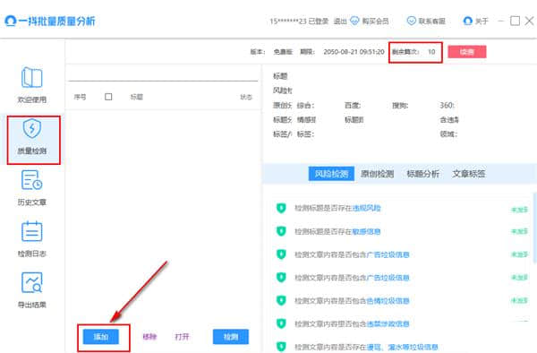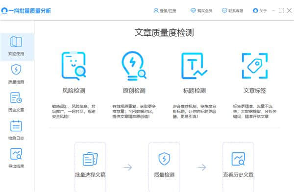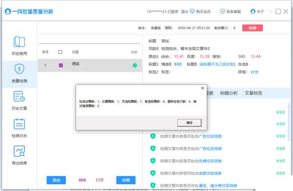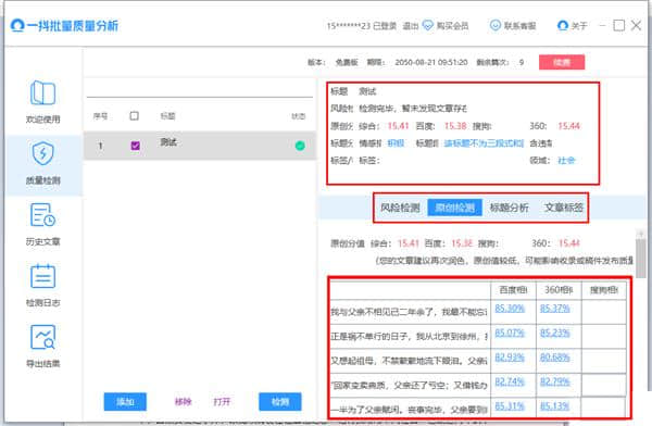 一抖批量质量分析软件下载,文章原创性查询智能批量检测软件,一抖批量质量分析(文章质量检测工具)让你轻松查询自己的文章原创性和各种媒体的平台数据明星内容,同时对多平台数据进行检测和扫描,可以彻底消除各种内容的碰撞,可以检测到所有的原值和风险值。