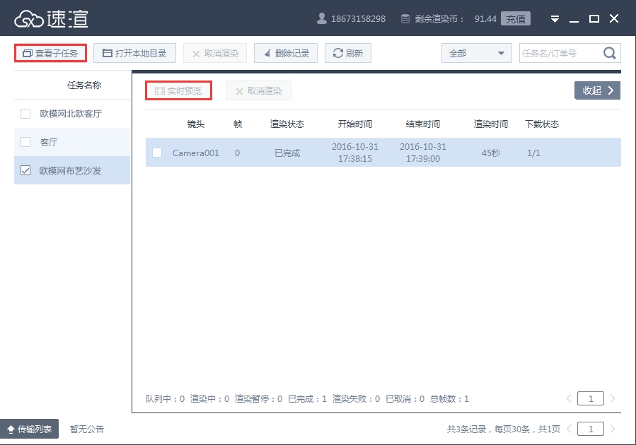 问:如何在任务显示渲染中检查渲染状态?答:对于渲染中的任务,可以查看当前订单,点击客户端页面查看子任务-实时预览(为了提高预览响应,预览图会被压缩传输,如果预览与本地不同,请联系客服咨询)。