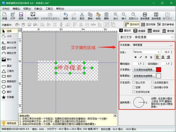 神奇透明水印设计 Software是由北京幻彩像素科技有限公司开发的专业、易用、高效的透明水印软件,支持制作各种透明水印效果,提供多种对象元素,包括文字、图片、图形、圆形字符等。可以随意使用,随意设计,使用方便,快速灵活,能在短时间内产生符合要求的高标准透明图片水印。一键导出PNG格式图片。