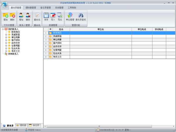 易信精英商务软件包含丰富的通讯录管理功能,支持全数据库搜索,界面设计精美。它可以建立多个数据库、联系人组和公司管理。丰富的通讯录、个人相册、联系人模糊搜索、个人联系人和群组联系人批量EXCEL导出保存、联系人导入、打印预览打印、加密账户设计。