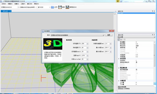 5.模型设置功能,支持底板设置、裙圈数、裙间距、裙方向、网格使用、网格间距、网格高度、网格与模型的间距。