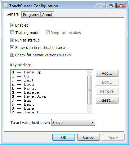 TouchCursor默认情况下,空格键用作激活键。按住空格键时,绑定会被激活,可以实现绑定键的功能。释放空格键后,绑定的键将恢复其原始功能。您可以将空格键更改为更方便的键。