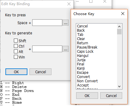 在配置界面中,有些按键是默认绑定的。例如,H键绑定到向上翻页键。当H键被激活和按下时,它充当向上翻页键。如果您对绑定按钮不满意,可以单击“编辑”按钮在选择绑定后再次编辑绑定,或者单击“添加”按钮添加新绑定。