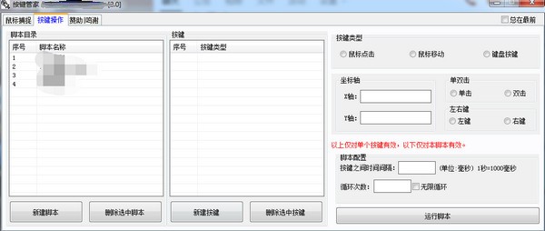 按键管家无需任何编程基础即可快速入门。用户可以通过所有图形交互界面制作自己的击键脚本,只需输入鼠标坐标、点击次数、时间间隔等诸多数据即可生成。