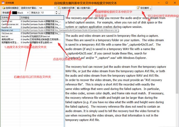 2.选择搜索文件列表,您要检索数据的文本中的文本将输入生效,您可以定位文本位置。