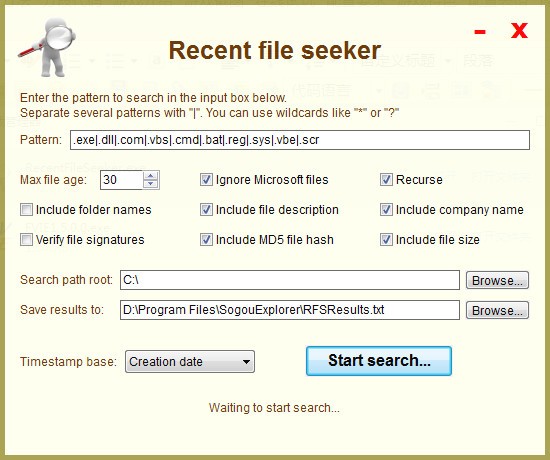 最近文件查找器Recent file seeker可以帮助您查找最近打开的文件,并根据上次修改日期搜索/访问扩展名为的文件。您可以设置其他过滤器,例如(中天)最早的文件和文件名模式。该应用程序扫描的用户定义文件夹,并将搜索结果保存到计算机上的文本文件中。