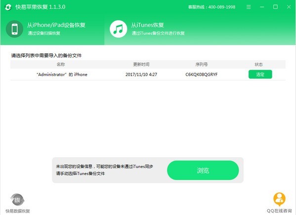 2.从iTunes恢复:默认情况下,软件只扫描iTunes备份目录中的文件。如果用户使用其他备份工具(或将iTunes备份目录复制到其他文件夹),需要点击软件上的“预览”按钮,自行选择扫描目录。