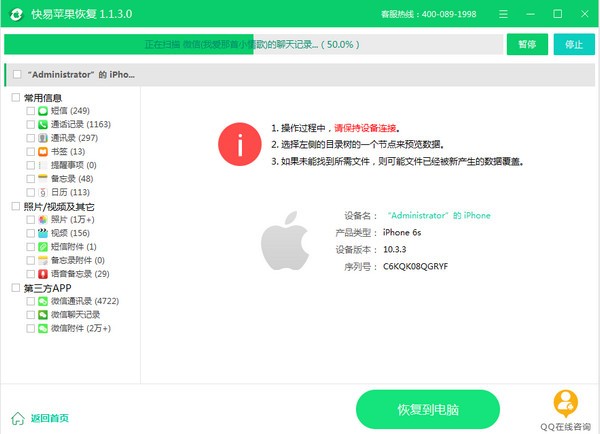 1.根据用户检查的扫描类型和手机的数据大小,从iPhone/iPad设备恢复的这一步可能需要很长时间。请耐心等待扫描结果。