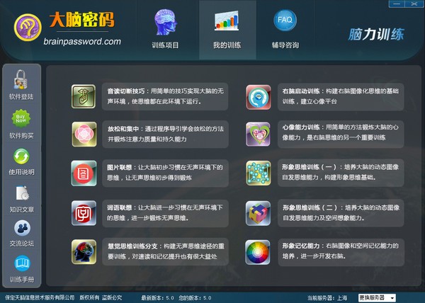 大脑密码脑力训练软件是一款专注于开发和训练脑力的软件。大脑密码脑力训练软件通过无声思维训练法和右脑训练法帮助用户训练和提高训练思维能力,从而提高脑力。