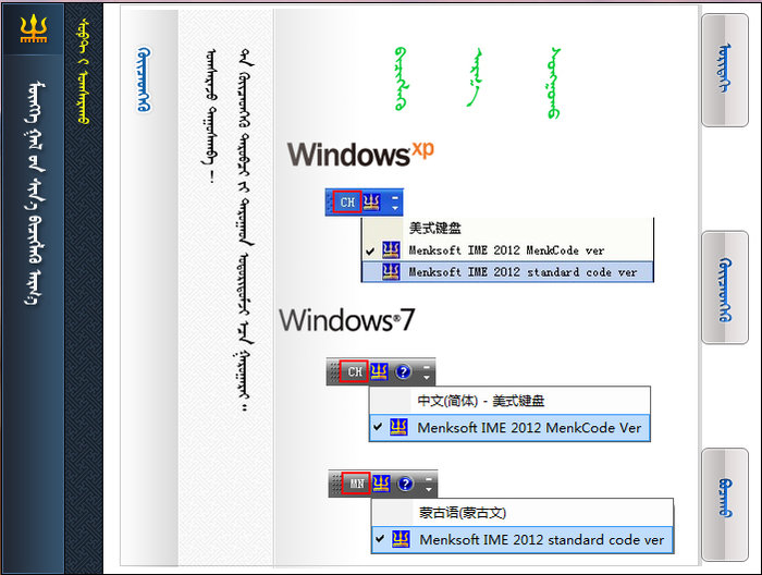 输入法可分为蒙古文代码版(放入CH语言栏)和标准代码版(放入xp的CH语言栏,放入vista及以上版本的MN语言栏)。