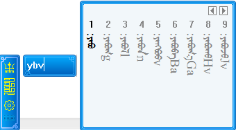 输入字母后,候选框中显示的粗体字是与输入代码匹配的蒙古语单词,灰色字是部分匹配的单词。用户可以根据灰字下方的输入码提示继续输入,最多显示后面三个字母,其中大写字母是下一个音节的第一个字母,用户可以直接输入大写字母快速输入下一个音节,例如,如果用户想继续输入yabvba,只需在ybv的基础上直接输入B即可。