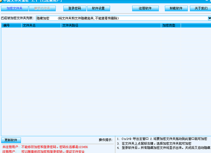 隐藏加密文件夹,瞬间隐藏加密指定的文件夹。加密后,除非你打开软件。