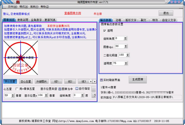靖源图章制作专家一款好用的邮票制作软件,输出的是png、gif、bmp、jpg、tif图形,而且图片是透明的。