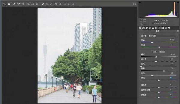 在基本里拉低曝光中,为了在更亮的地方显示细节,适当减少高光,适当增加阴影,因为这种户外风格不需要太高的明暗对比,如果画面还是太亮,就把白色调低一点。这些数值要根据照片的实际情况进行调整。一般照片比较准确,稍加调整就够了。