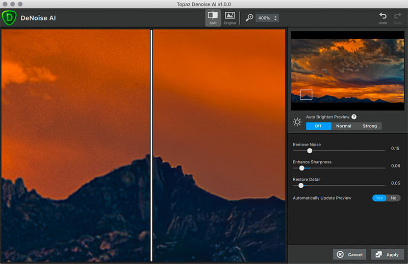 提高预览的亮度,以更好地处理黑暗区域的噪音。