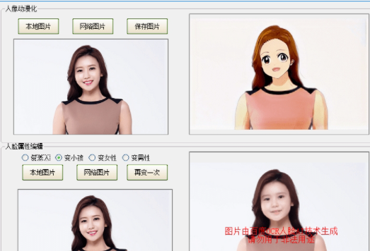 人脸动画人脸编辑器是一个特殊的转换软件,可以将图片中的人脸转换成电脑上的动画人脸。人脸动画/编辑器的用法也很简单。上面两个框是动画区域,下面两个框是编辑区域。脸可以是动画的、老年的、年轻的、变化的等等。