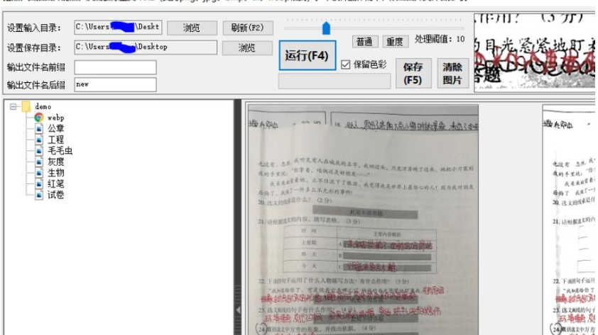 4.支持三种漂白算法和两种漂白方法。漂白速度在几十毫秒到几秒之间。支持色彩保持。可以保留公章或试卷的红/蓝笔颜色。