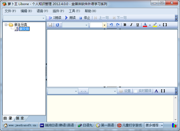 萝卜王Libone是专门为外语学习设计的知识管理软件,集多语言翻译、文本阅读、文本编辑、文档打印、文本编辑、数据加密、笔记保存等多种功能于一体。同时模拟了系统的资源管理器,方便用户以文件夹和文件的形式对自己的数据进行分类管理。萝卜王是一个免费软件。