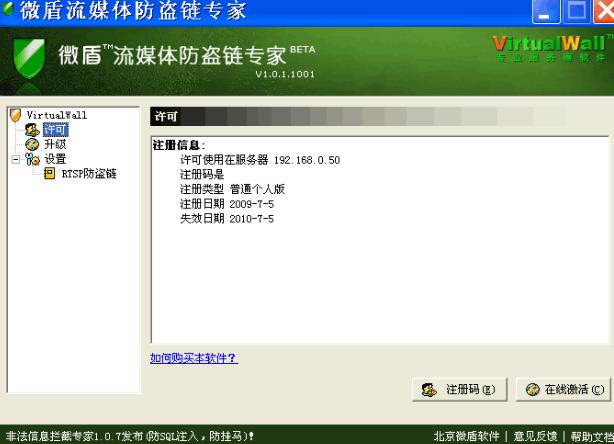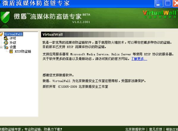 微盾流媒体防盗链专家是基于底层防火墙的技术,可以帮助你拦截各种协议的链式窃取。目前,版本已经支持RTSP流媒体协议的防盗链。有Micsoft服务、Real服务器、Helix服务器等应用。使用RTSP协议。