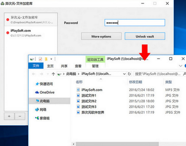 当您需要使用您的文件时,打开Cryptomator选择您的“文件库”,输入正确的密码,按“解锁Vlt”解锁,库将通过WebDav自动解密并加载到新的驱动器中(可能就像插入u盘一样),您可以像往常一样工作,随意将文件保存、删除或修改到该磁盘中,并使用它。