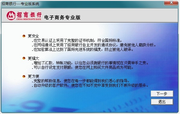 招商银行电子商务专业版是招行主要面对持有公司卡或信用卡公务卡的持卡人推出的系统,电子商务专业版只能是文件证书,不需要usb-key,公司卡用户必须使用电子商务专业版!