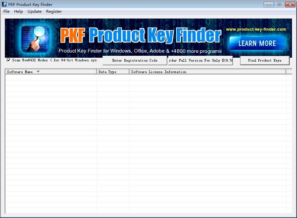PKF产品密钥查找器是一个软件,可用于检索您的软件产品密钥(序列号或注册码)。支持Windows 8、Windows 7、Windows XP、Micsoft Office、Adobe CS6、CS5、CS4、CS3、ACNIS、EA games、WinZip、Ne等4800多个软件。重新安装系统或产品时,您可能需要输入序列号或密钥。如果忘记了,可以用这个工具找回。限制:未注册版本仅显示序列号的前4位数字。