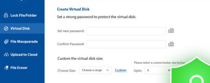 创建虚拟磁盘:这个文件柜对于PC功能的另一个很棒的功能是,你可以在电脑上创建一个虚拟磁盘/空间。只需在计算机上的任何位置创建一个虚拟磁盘,并将所需的文件/文件夹拖放到磁盘上。这将把您想要的文件和文件夹加密到一个类别中,以便更好地管理。