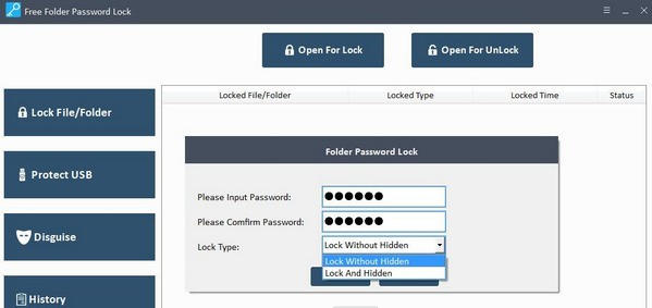 单击锁定文件/文件夹,然后单击打开锁定按钮选择要加密的文件、文件夹或驱动器。之后可以输入密码,选择锁的类型:隐藏锁或隐藏锁。单击锁定按钮。如果要解锁文件,请先选择文件,然后单击“解锁”按钮继续。