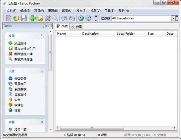 程序窗口的大部分内容被文件列表占据,该列表列出了项目中的所有文件。实际上,有两个文件列表——一个用于打包到安装可执行文件数据存档中的文件,另一个用于与安装可执行文件一起分发的外部文件。您可以通过单击相应的选项卡在归档文件列表和外部文件列表之间切换。