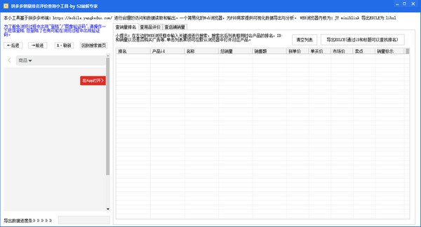 拼多多销量排名评价查询小工具,基于拼多多的H5终端进行合理的访问、数据读取和输出,简单的Web浏览器,为PDD商家提供可视化的数据导出和分析。WEB浏览器的内核是JY小链接,导出的EXCEL是libxl!