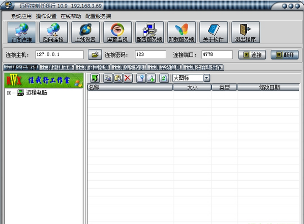 远程控制任我行是一款非常好用的远程控制软件,能够让您得心应手地控制远程主机,就像控制自己的电脑一样。我们这款软件中我们不仅仅包括远程关机、远程重启计算机、锁定鼠标、锁定桌面及锁定任务栏等多项功能限制;我们还包括对主键的浏览、增删、复制、重命名和对键值的读写等所有注册表作功能;它拥有非常丰富的远程控制功能,可以让用户在一台电脑上随心所欲地控制另一台电脑。远程控制任我行使用起来十分简单方便,它不需要各种复杂的作,支持正向和反向连接,方便用户随时进行远程控制。