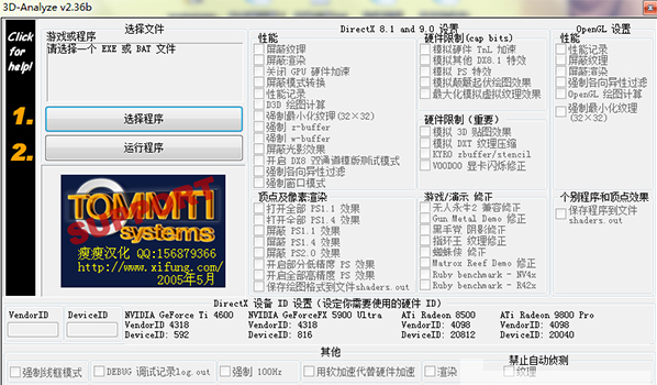 ToMMTi-s出品的3D-Analyze(3D分析者)v2.36b版,这款软件是一款基于DirectX和OpenGL的工具。运行的时候必须选择EXE/BAT文件才可以,支持很多测试程序和游戏程序,是一款可使低端显卡玩高端游戏或者运行高端测试软件的软件。修正了软件原版在低分辨率下的界面显示问题。附实况足球8的3D-Analyze中英文版设置截图。