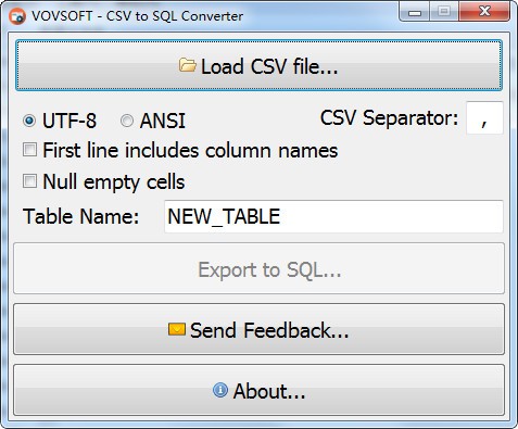 该应用程序将允许您在单个文件上执行快速的CSV到SQL转换,而无需任何特殊配置或高级知识。然而,缺点是应用程序总体上缺乏简单性,例如缺乏高级功能,如批处理,这可能非常有用。
