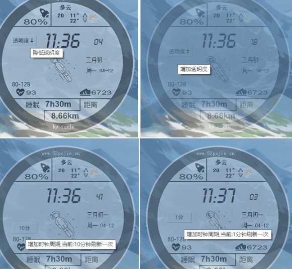 通过点击4个按钮调整透明度和天气采集的时间间隔(默认每2分钟一次)[PS:百度搜索天气采集太快,可能会被限制]