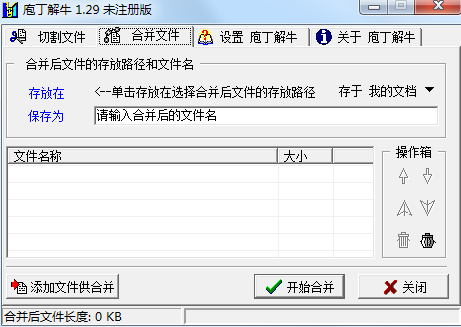 庖丁解牛版本简单方便的文件拆分和合并工具。庖丁解牛电脑版有直观清晰的中文界面,允许用户根据自定义大小剪切指定文件,并将剪切的子文件合并还原为源文件。庖丁解牛该软件可以满足用户对文件分割和合并的基本需求。