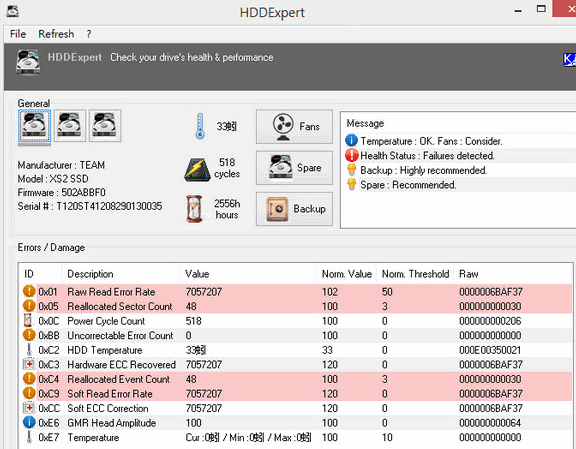 磁盘错误检测(HDDExpert)针对任何读取错误、写入错误等。,只要有任何错误,记录就会被框成红色。当发现错误时,你应该对数据更加小心,记得养成定期备份的好习惯。
